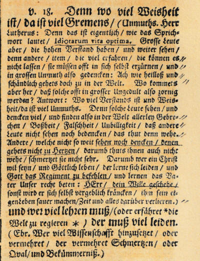 Prediker 1:18 (Calov, met markeringen van Bach)