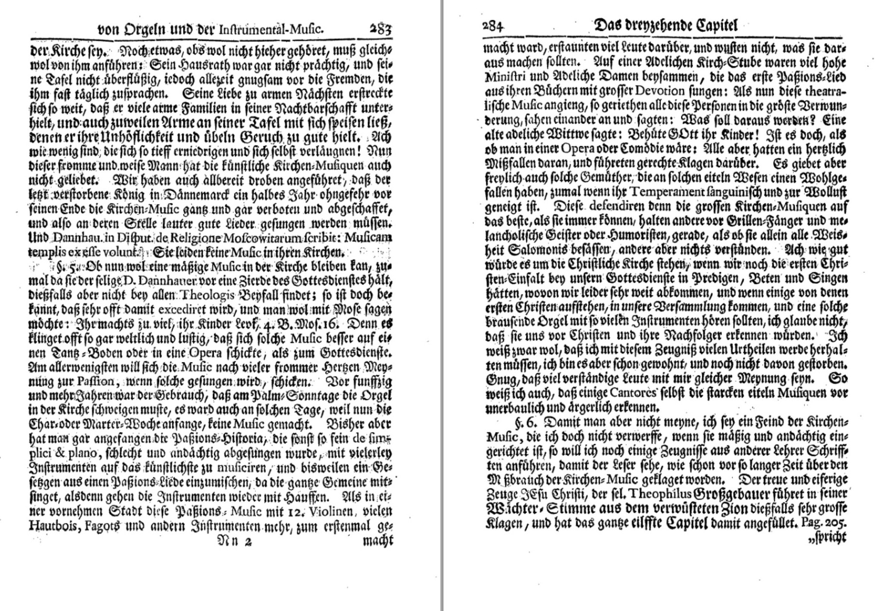 | Am allerwenigsten will sich die Music nach vieler frommer Hertzen Meynung zur Passion, wenn solche gesungen wird, schicken. Vor fünfzig und mehr Jahren war der Gebrauch, daß am Palm-Sonntage die Orgel in der Kirche schweigen muste, es ward auch an solchen Tage, weil nun die Char- oder Marter-Woche anfange, keine Music gemacht. Bisher aber hat man gar angefangen die Paßions-Historia, die sonst so fein de simplici & plano, schlecht und andächtig abgesungen wurde, mit vielerley Instrunenten auf das künstlichste zu musiciren, und bisweilen ein Gesetzgen aus einen Paßions-Liede einzumischen, da die gantze Gemeine mitsinget, alsdenn gehen die Instrumenten wieder mit Hauffen. | Volgens de mening van veel vrome harten past zulke muziek helemaal niet bij de Passie, als die gezongen wordt. Tot voor vijftig jaar en langer was het de gewoonte dat op Palmzondag het orgel in de kerk moest zwijgen; ook werd er op die dag, omdat dan de Goede Week of de Lijdensweek aanbrak, geen muziek gemaakt. Onlangs echter is men begonnen om zelfs de lijdensgeschiedenis — die voorheen zo fraai de simplici & plano [eenvoudig en rechttoe rechtaan], sober en devoot werd gezongen — met velerlei instrumenten op de meest kunstzinnige wijze te musiceren, en er soms een een kleine stukje uit een passielied doorheen te mengen dat door de hele gemeenschap wordt meegezongen, waarna dan de instrumenten weer in groten getale invallen. |