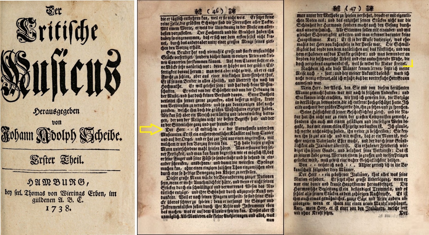 Op 14 mei 1737 verscheen in Hamburg de 6de aflevering van de Critische Musicus, begin dat jaar opgericht door J.A. Scheibe (1708–1776, zoon van de orgelbouwer, had jura en filosofie in Leipzig gestudeerd, organist, was als muziekcriticus voorstander van de nieuwe 'galante stijl'). In dit nummer gebeurt iets bijzonders. Een "Brief eines reisenden Musikanten" (brief van een rondtrekkende muzikant) onderbreekt op de eerste pagina het net aangevatte artikel over Gottsched. Die brief bevat een geanonimiseerde beschrijving van een hele serie hoog aangeschreven musici, per stad. De stijl is satirisch, behoorlijk scherp. Tegen het eind passeert een uitzonderlijk begaafde toetsenist (beide op het clavecimbel en op het orgel) de revue, die ook nog eens bijzonder vernuftige contrapuntische composities schrijft. In de lof is de kritiek al verpakt. In het tweede deel wordt die uitgepakt. Voor elke lezer is duidelijk dat het hier over J.S. Bach gaat. Overigens wordt Bach —vergeleken met sommige van z'n collega's die hem voorafgaan — met veel respect behandeld.